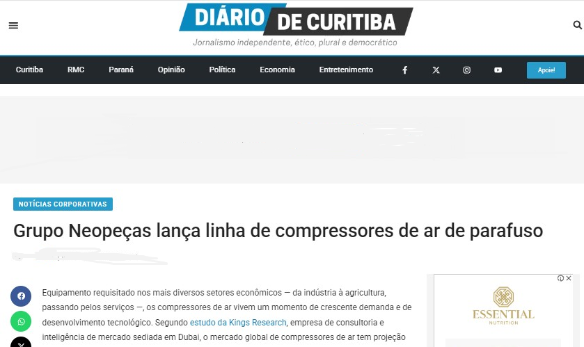 O Diário de Curitiba destacou recentemente os compressores Neocomp pela sua eficiência e confiabilidade. Esse reconhecimento reforça como a tecnologia da Neopeças acompanha as demandas da indústria moderna e confirma a qualidade dos equipamentos já presentes em diversos segmentos.